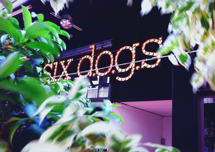 Six D.O.G.S. es un centro de entretenimiento cultural matutino y vespertino en el corazón de Atenas Monastiraki, que orgánicamente combina un espacio para presentar proyectos de arte visual y un bar con eventos. El bar se inauguró en octubre del 2009 y es un espacio oscuro alargado. Todas las superficies aquí han sido pintadas de negro, con la única fuente de luz que es una colorida lámpara griega de taberna que cuelga del techo en el centro del espacio.